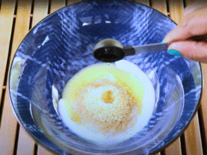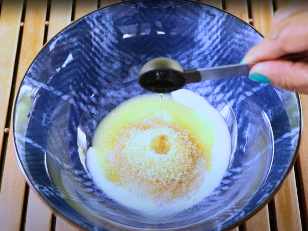 - Whisk the base: In a mixing bowl, combine the melted butter, milk, sugar, and vanilla until smooth and creamy.